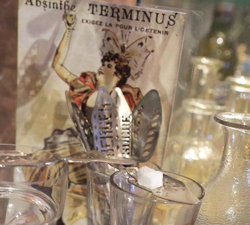 As in the 19th century, the absinth isn’t drunk pure. For the preparation of the absinth, we pour a little bit of absinth in the glass. We set a pierced spoon on the glass, then a sugar on the spoon. We pour iced water very slowly on the sugar. The sugar will become soaked with water, then will slowly disappear. Then the sugary water goes through the holes in the spoon and can mix with the absinth.