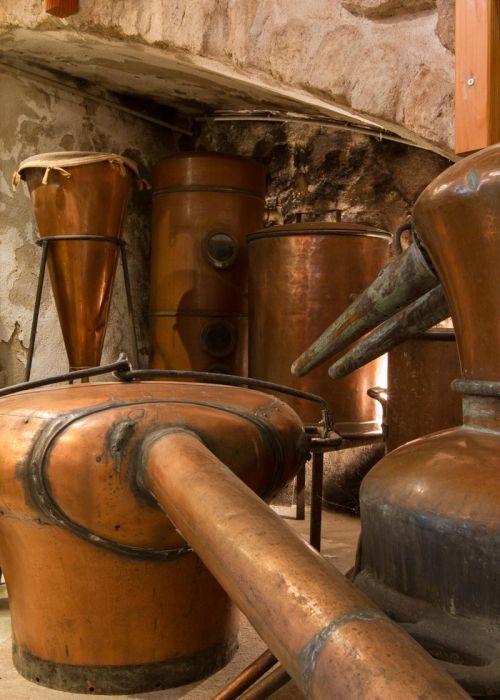 The fermented or macerated fruits are distilled in copper stills in order to produce brandy. The functioning of a still is very simple. The fruits are pumped in the copper vat and heated. These fermented or macerated fruits contain alcohol. But the property of brandy is to evaporate faster than water, in other words before the temperature reaches 100°C, the brandy evaporates and rises in the still.
